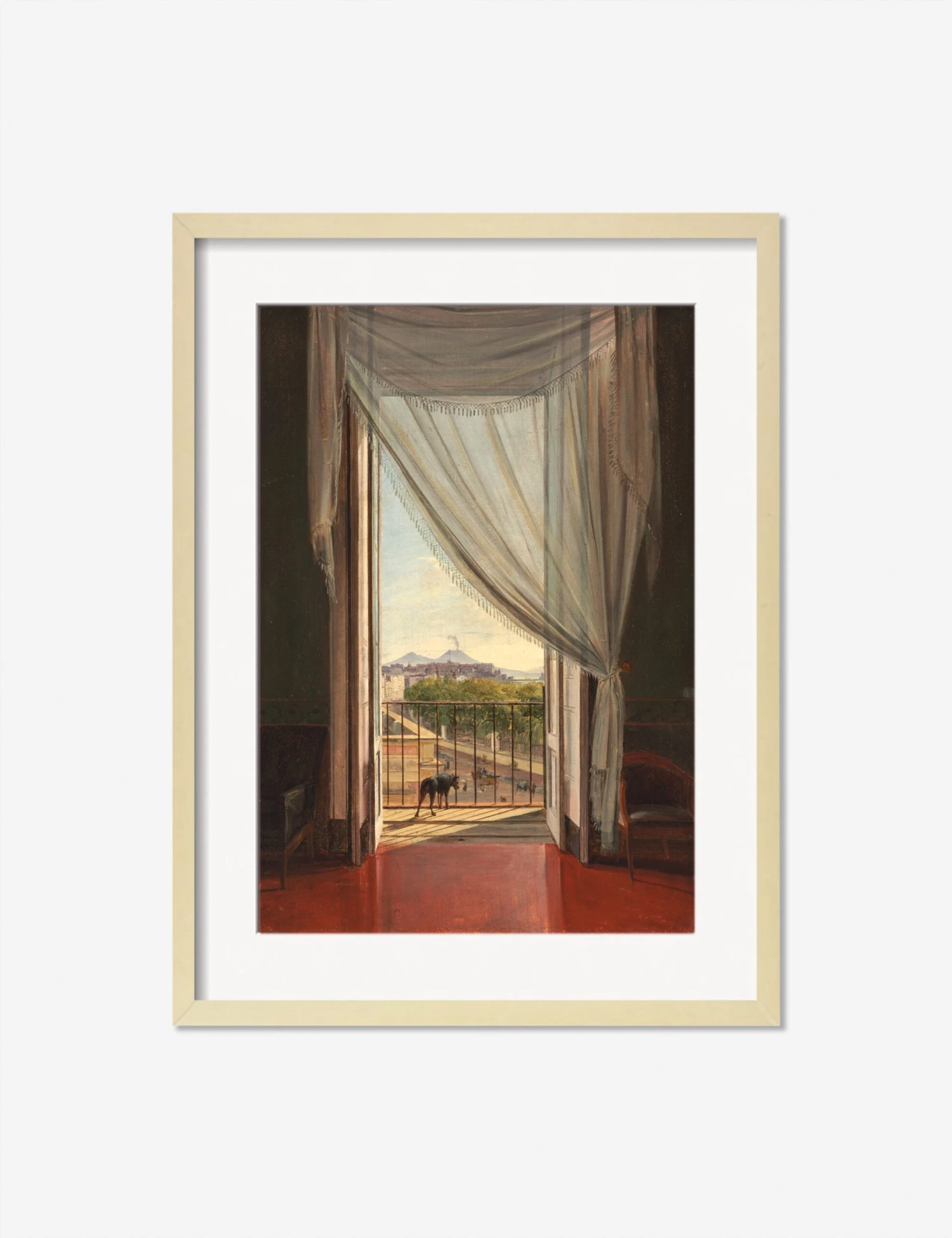 A balcony view opens up to sunlit streets with Mount Vesuvius in the distance, drawing the eye into this oil painting wall print. With its brilliant play of light and perspective, this piece can bring a sense of depth to your wall decor with a masterful touch.
