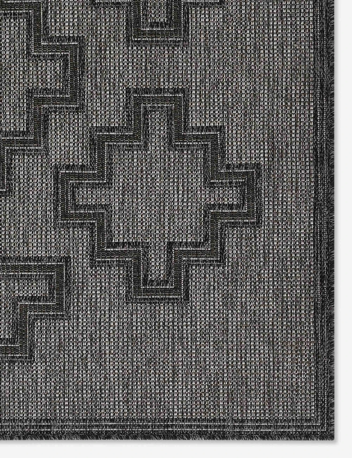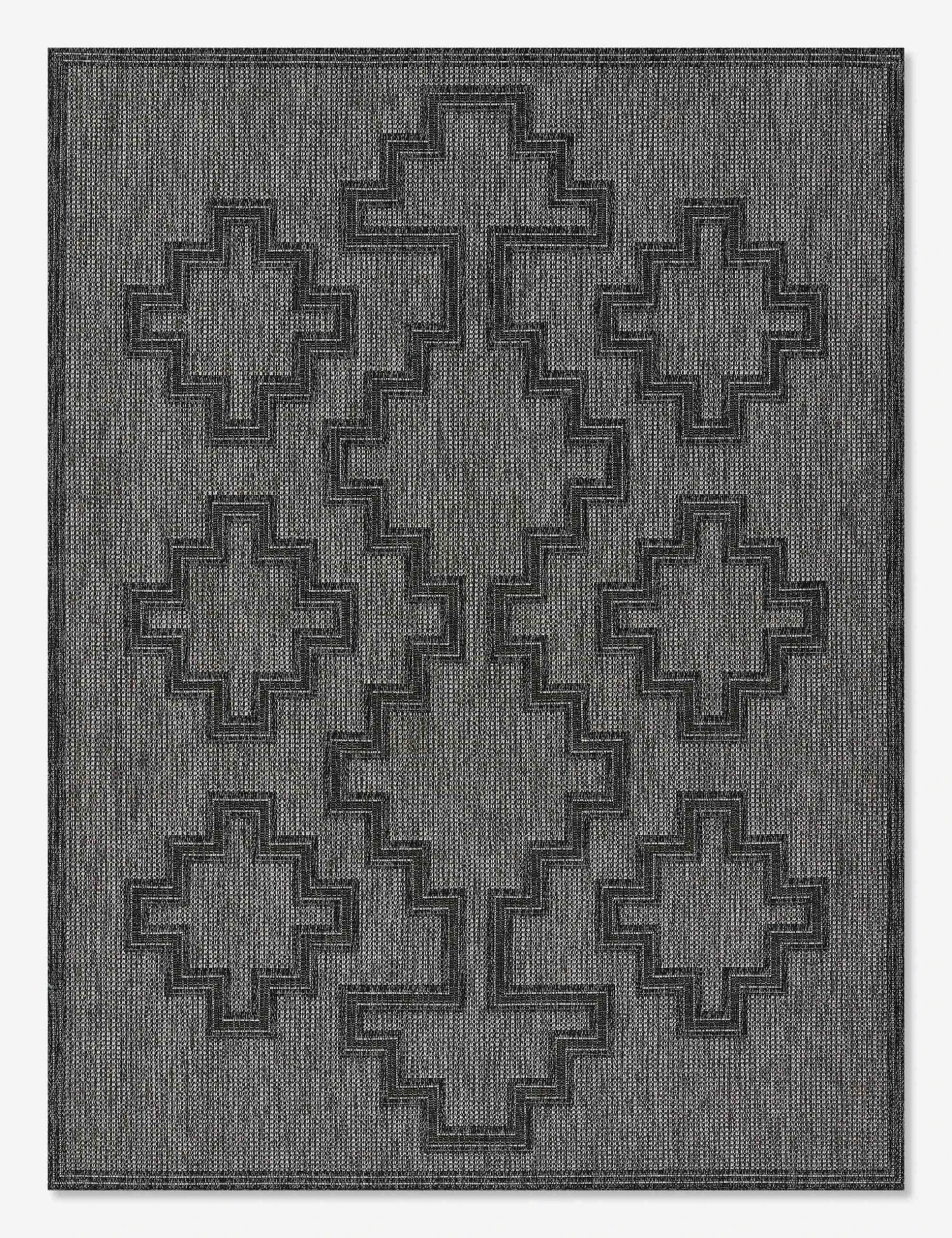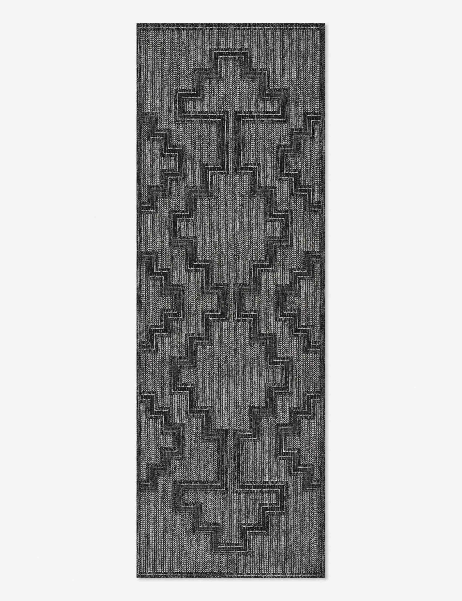 A moody black color palette is highlighted by a stepped, geometric pattern to make this flatweave area rug a refined accent for your home. Weather-resistant and durable, this floor rug is a great fit for outdoor living spaces, as well as high-traffic areas like entryways and living rooms.