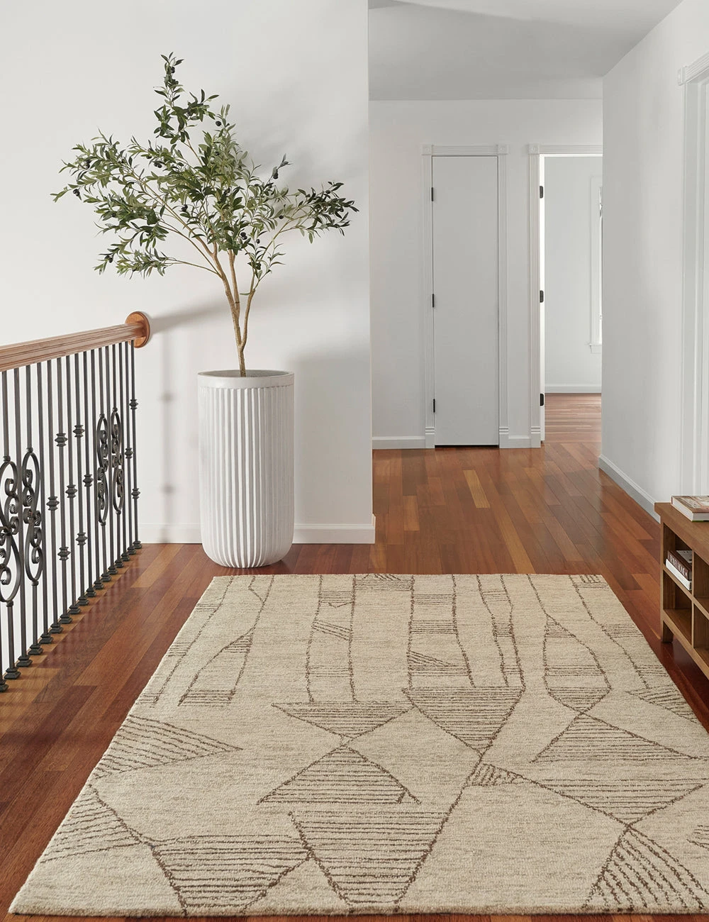 Blending an oversized, geometric arrangement with a neutral palette, this versatile rug provides a grounding element that can anchor a range of looks, from transitional to modern. The hand-tufted wool construction creates a soft, natural floor rug with durable appeal for high-traffic and transitional areas.