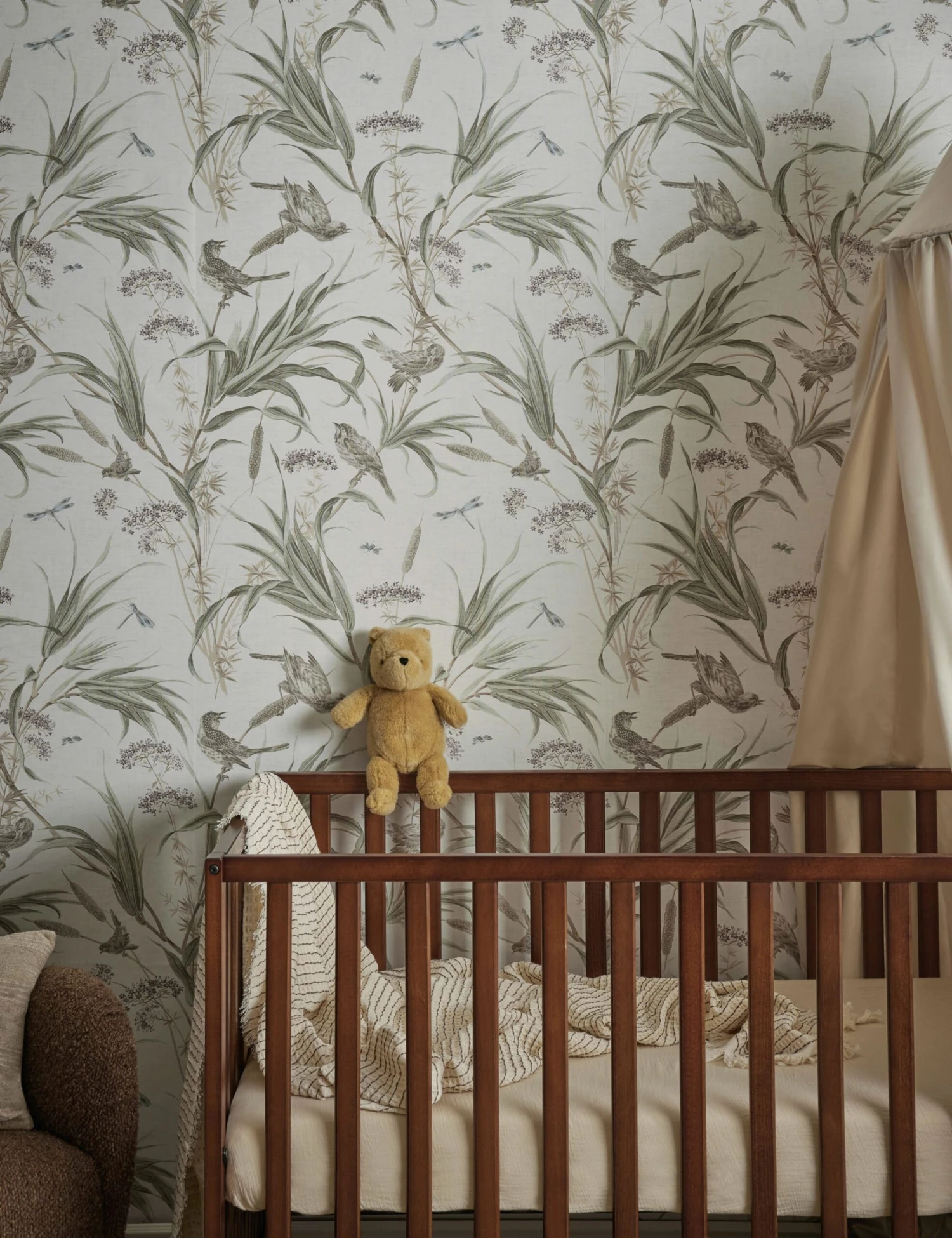 Revitalize your decor with a statement wall that brings the room to life. This delicate wallpaper motif offers a natural scene steeped in traditional charm with intricate illustrations of birds perched on botanical sprigs. Style this classic home wallpaper for a timeless backdrop in a nursery or powder room.