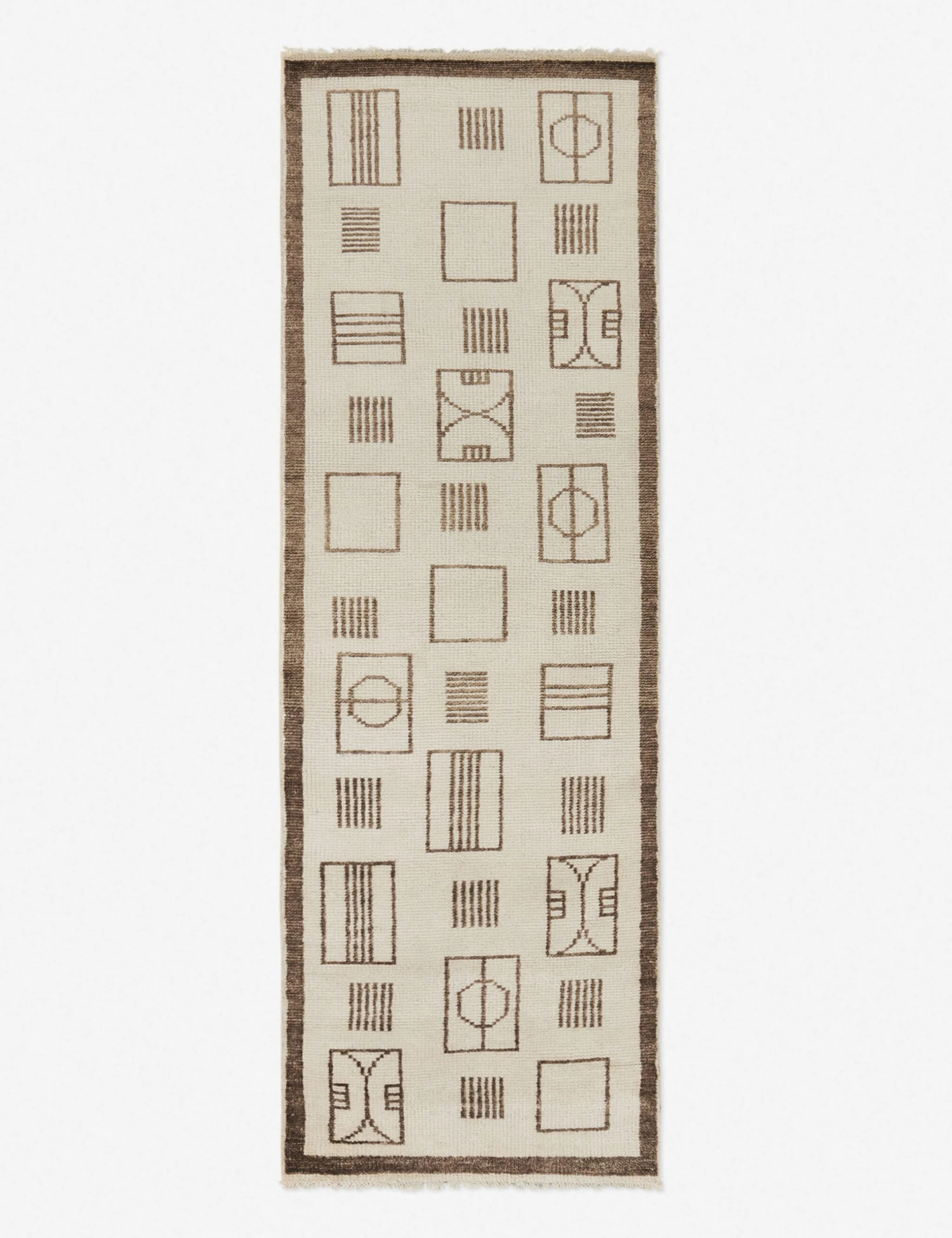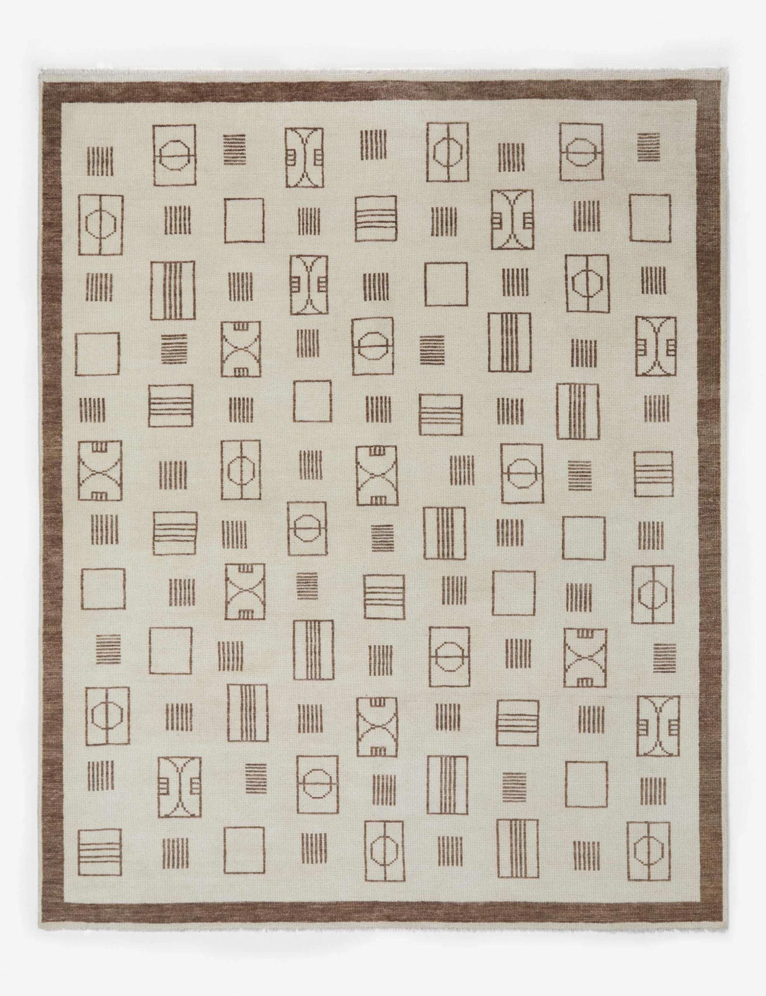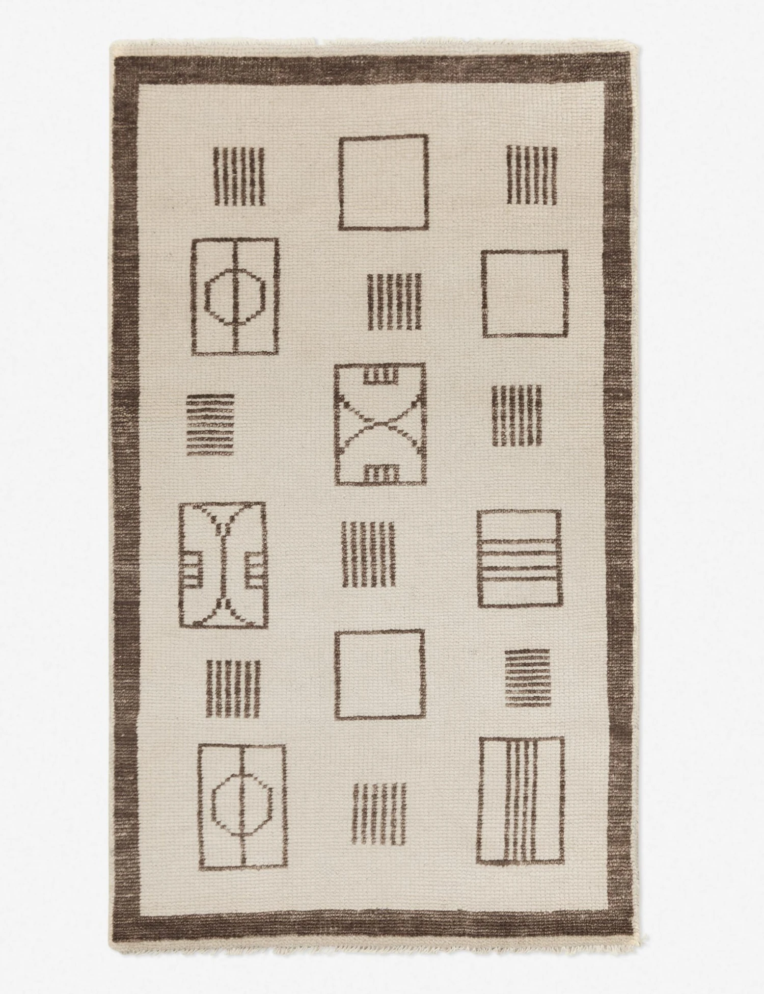 Featuring varying abstract geometric shapes throughout and a bold tonal border, the Jillian rug makes a neutral, yet impactful foundation to your home decor. This beautiful area rug is hand-knotted with fine loops creating a plush texture that is soft to the touch.