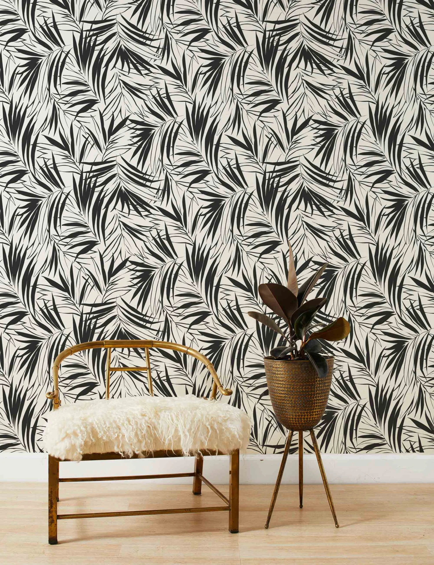Striking and sophisticated, this wispy palm leaf pattern stands out in a black on white wallpaper design. Add a stunning visual texture to your room by styling this pattern as a refined paper wall accent.