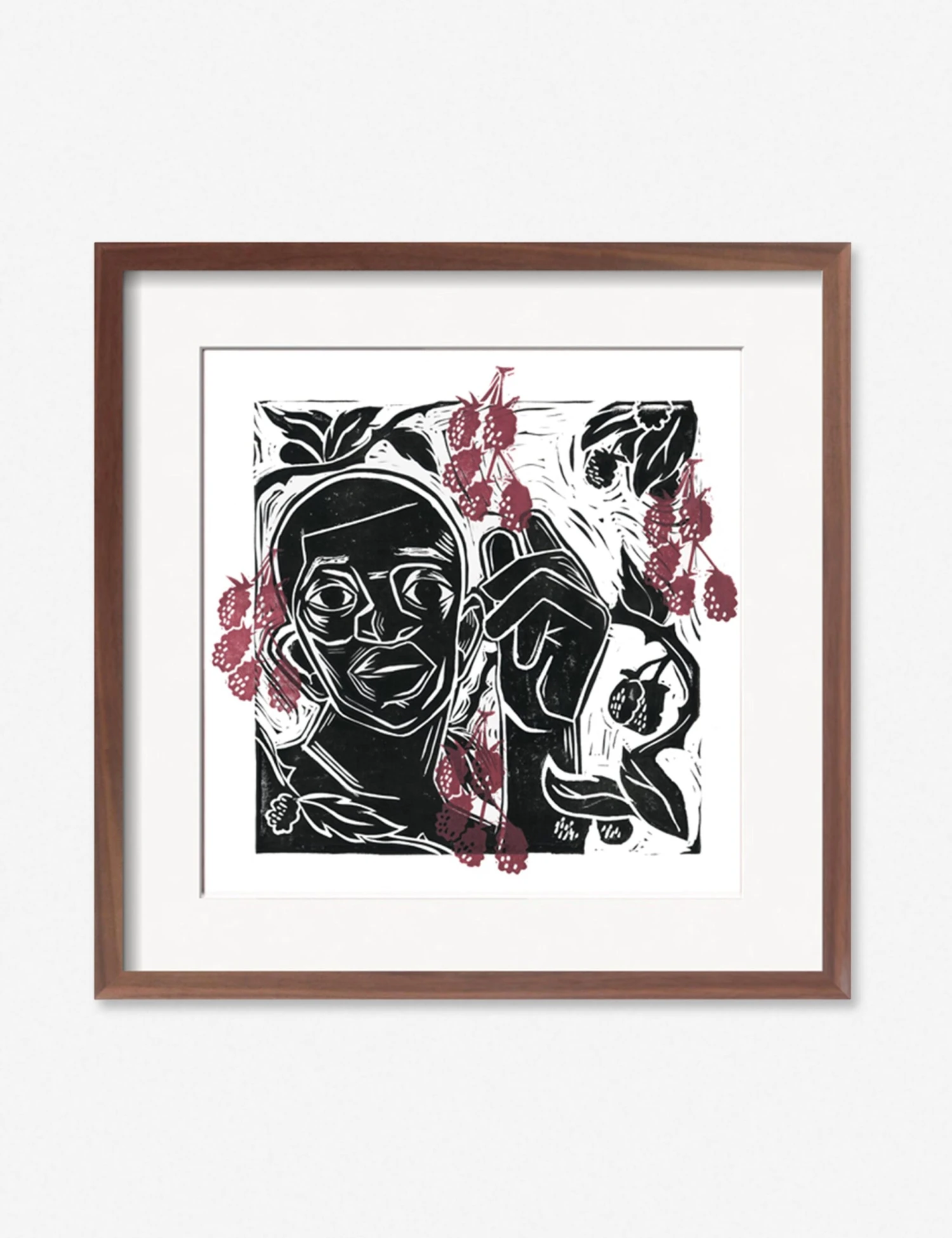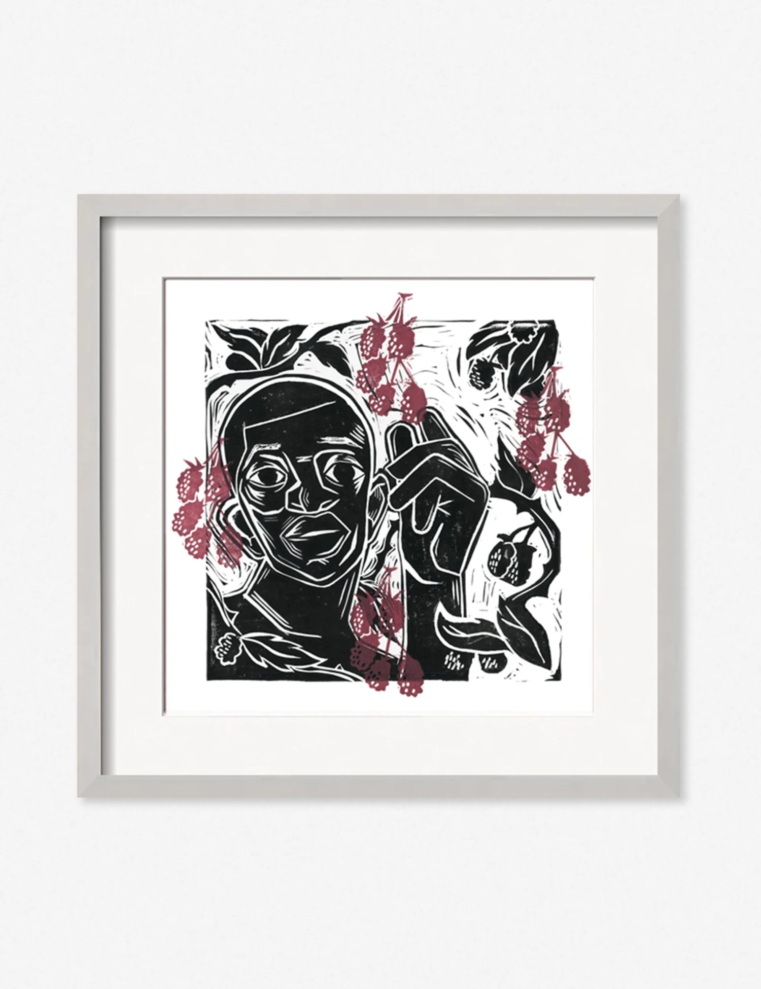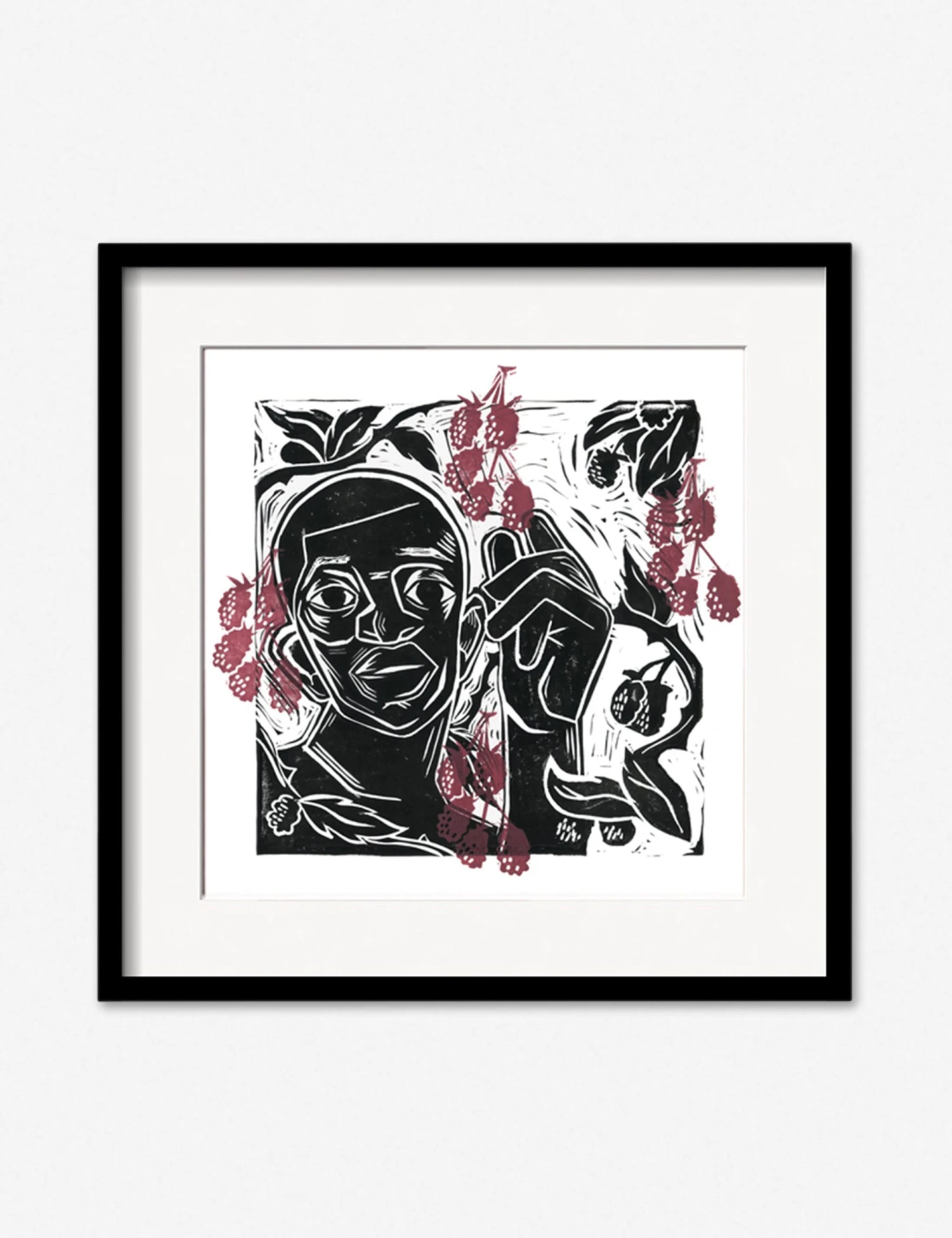 Adrian Brandon is a Brooklyn-based artist who works to share a broader understanding of the Black experience, with the hope for progress rooted in love and unity. Brandon captures expressions of closeness, family, and joy with an abstract yet vibrant fidelity in this exclusive wall artwork collection of linocut prints. Layers of color break the border of this wall art scene in which a subject is plucking fresh fruit from an abundant vine.