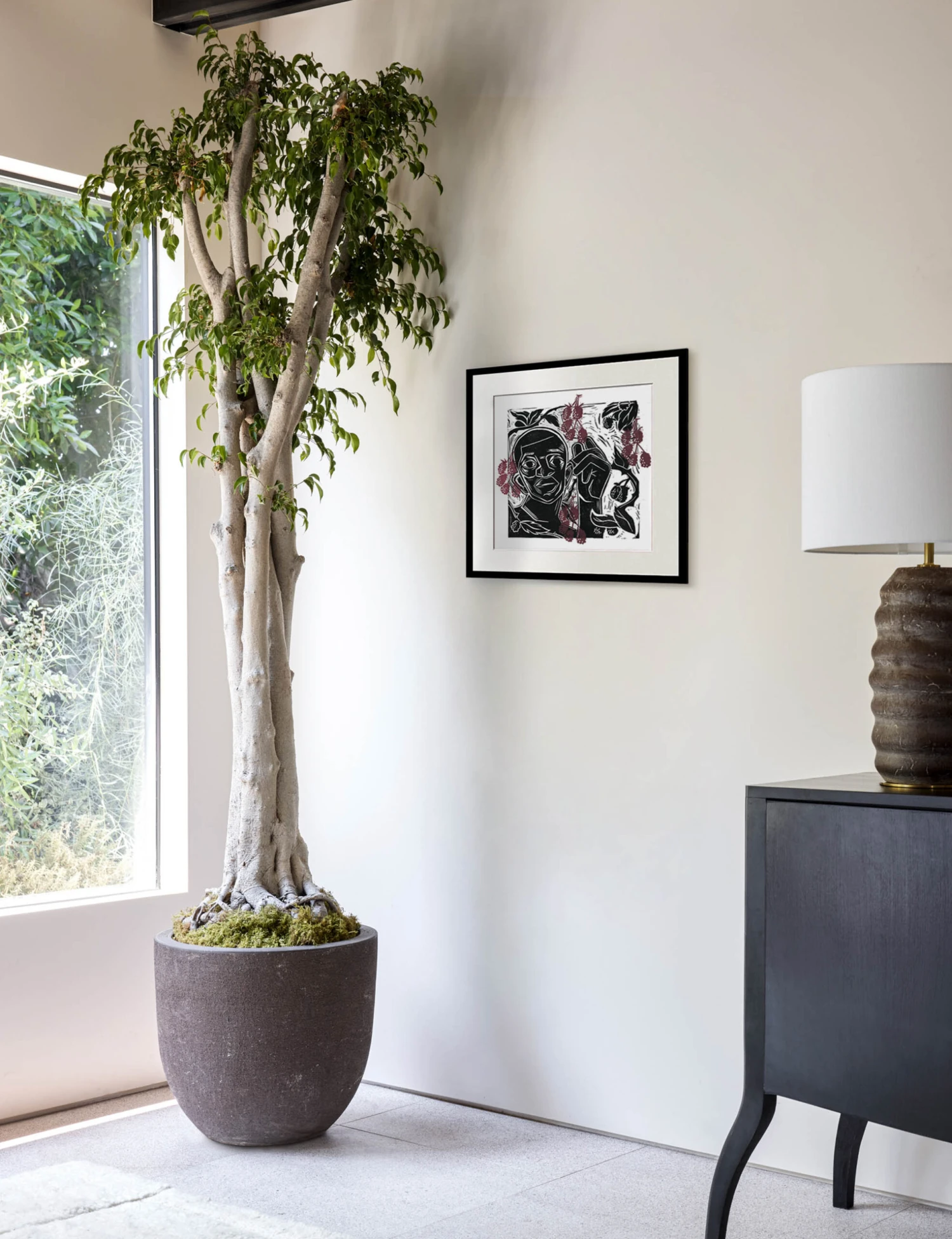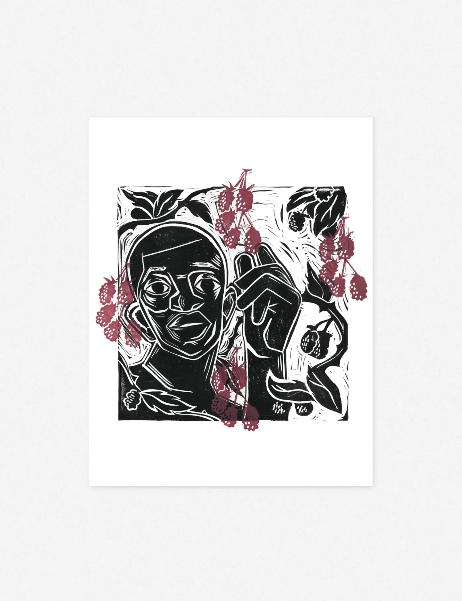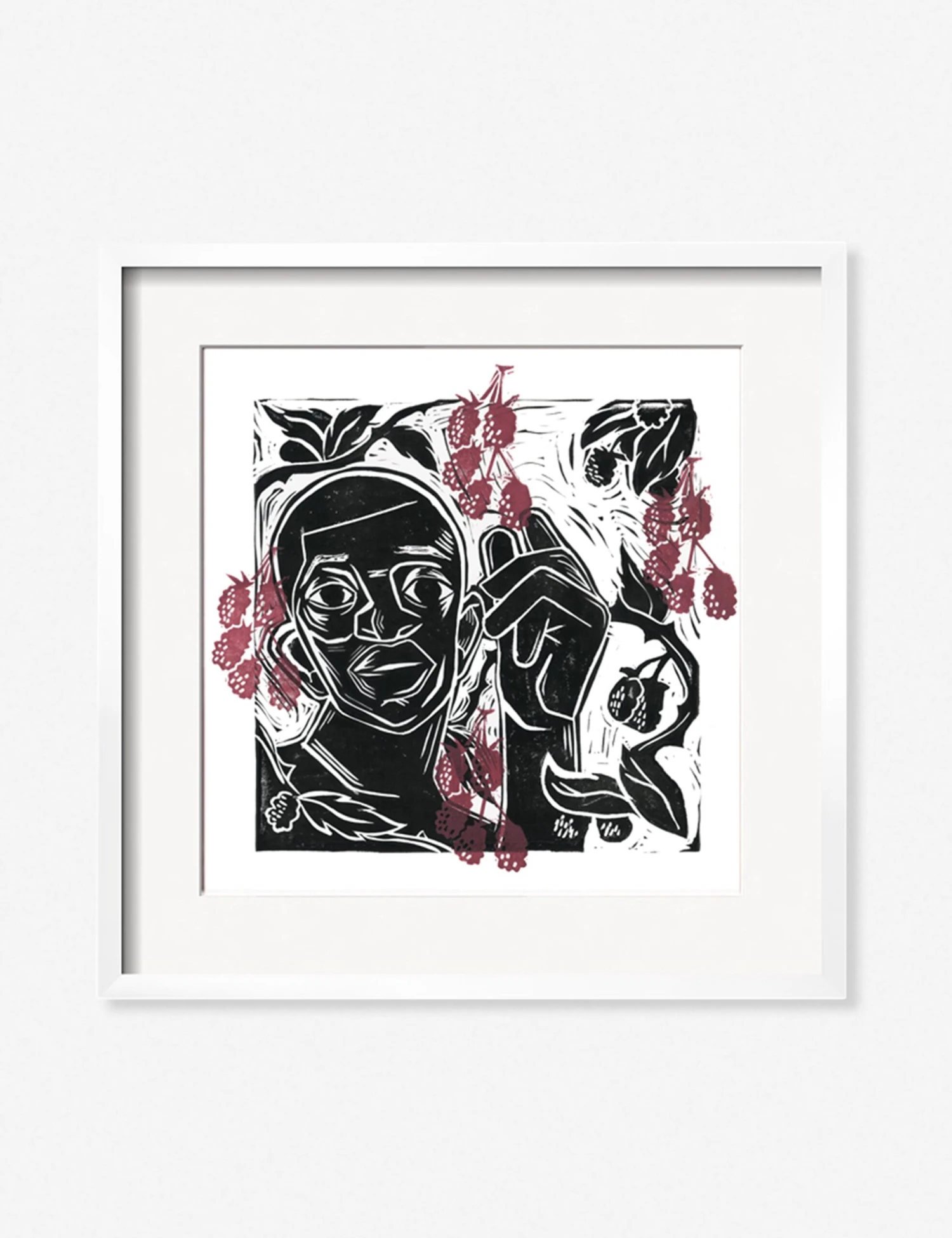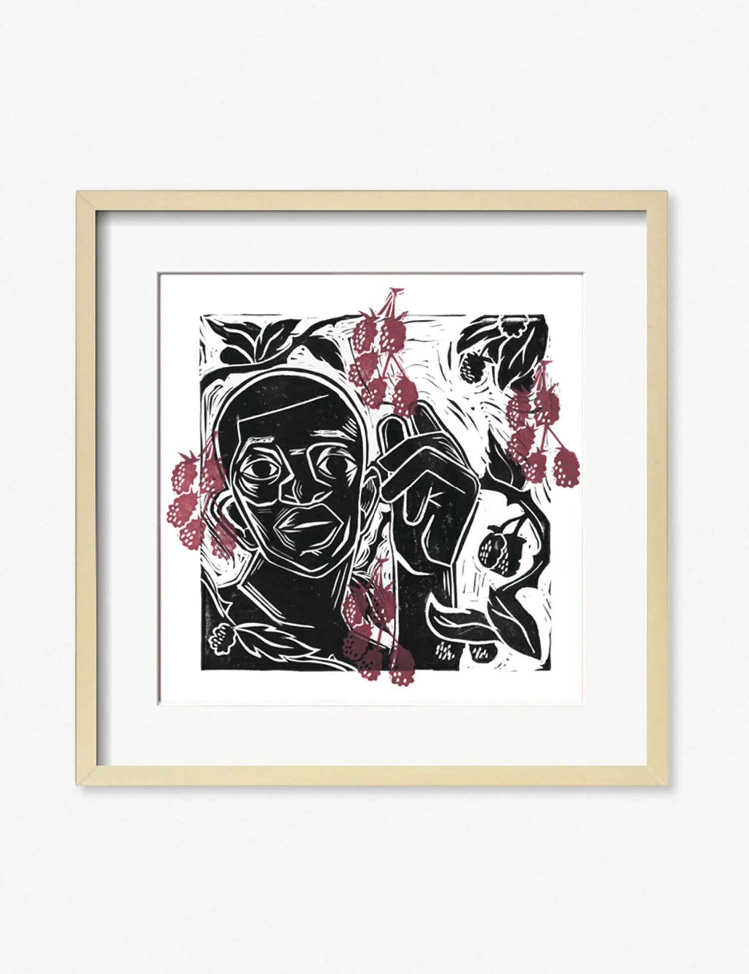 Adrian Brandon is a Brooklyn-based artist who works to share a broader understanding of the Black experience, with the hope for progress rooted in love and unity. Brandon captures expressions of closeness, family, and joy with an abstract yet vibrant fidelity in this exclusive wall artwork collection of linocut prints. Layers of color break the border of this wall art scene in which a subject is plucking fresh fruit from an abundant vine.