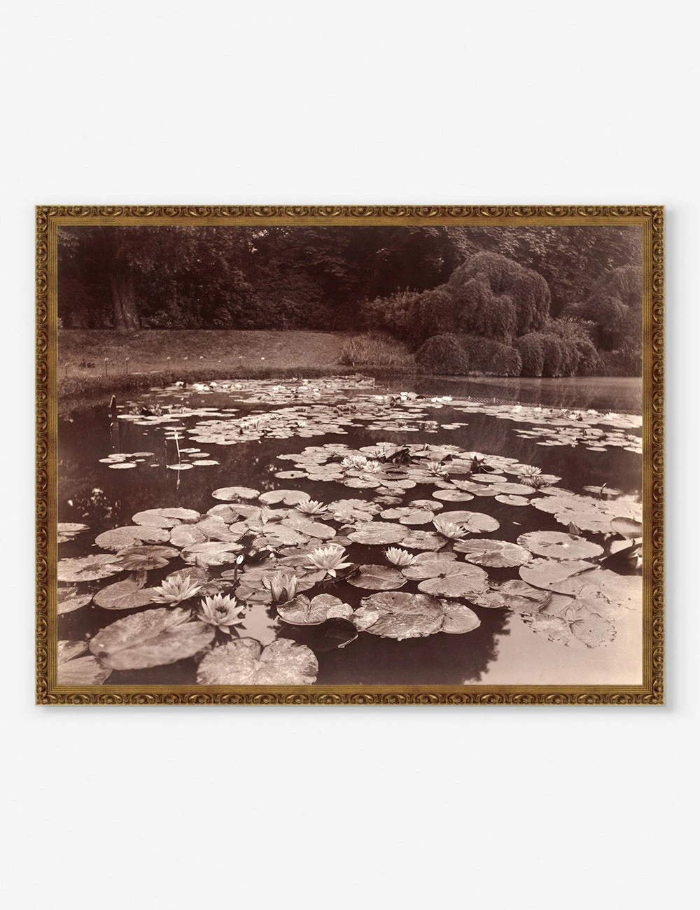 Lilies float on a pond set against a lush backdrop in this monochrome wall art print, offering a natural scene with antique undertones. This timeless piece is perfect for a serene art wall aesthetic in a spa bath or thoughtfully balanced living space.