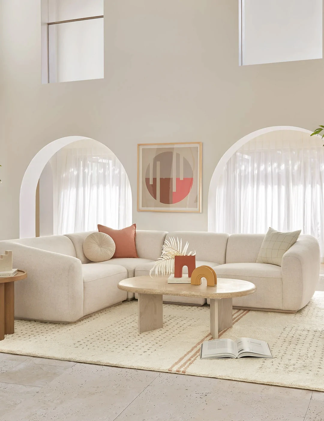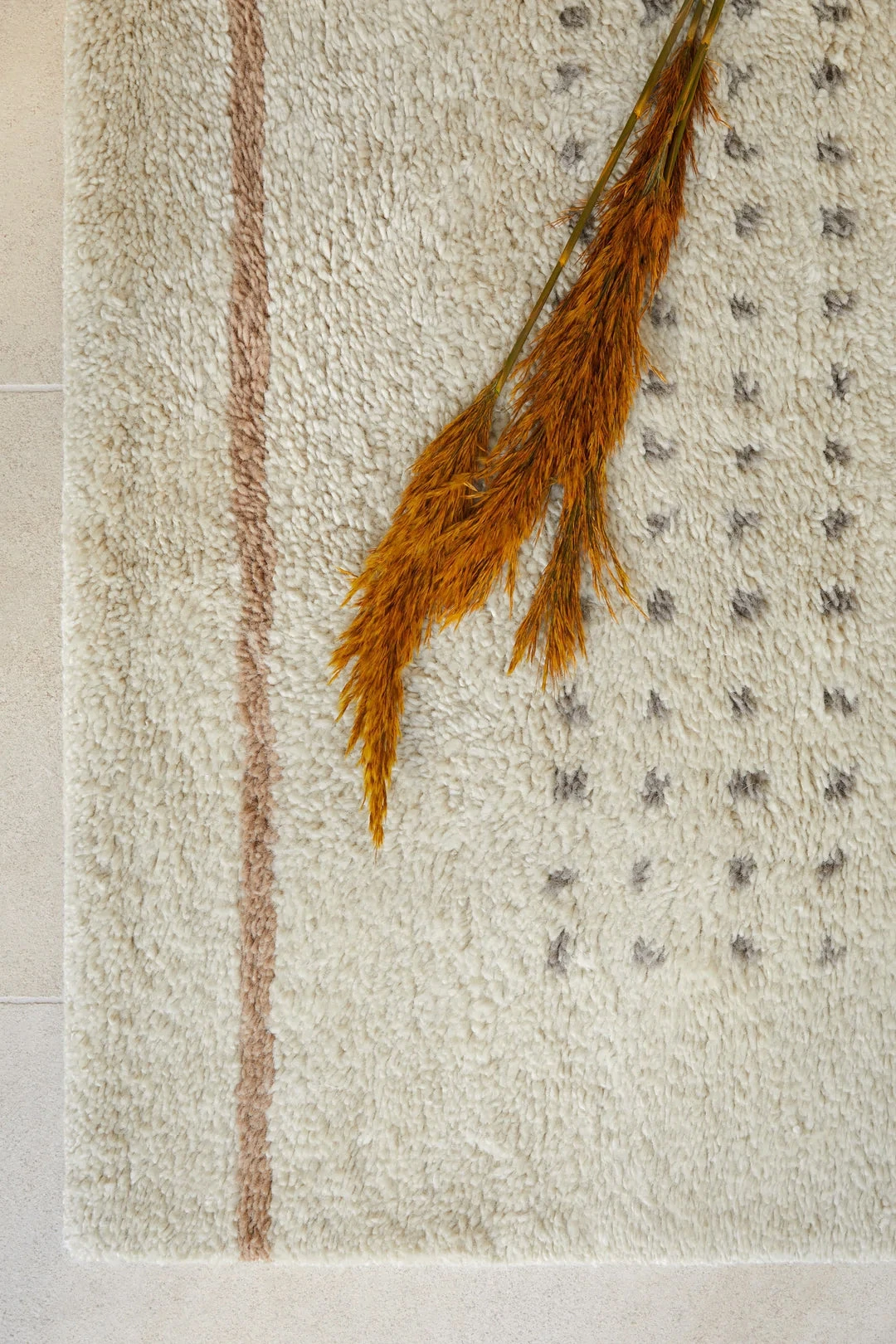 Inspired by the repetitive motifs and super soft pile of vintage Gabbeh rugs, this hand-knotted Rina floor rug features a simple geometric design of dots and stripes in a neutral palette. Crafted from a wool-viscose blend, this is an inviting area rug for your living room or bedroom.