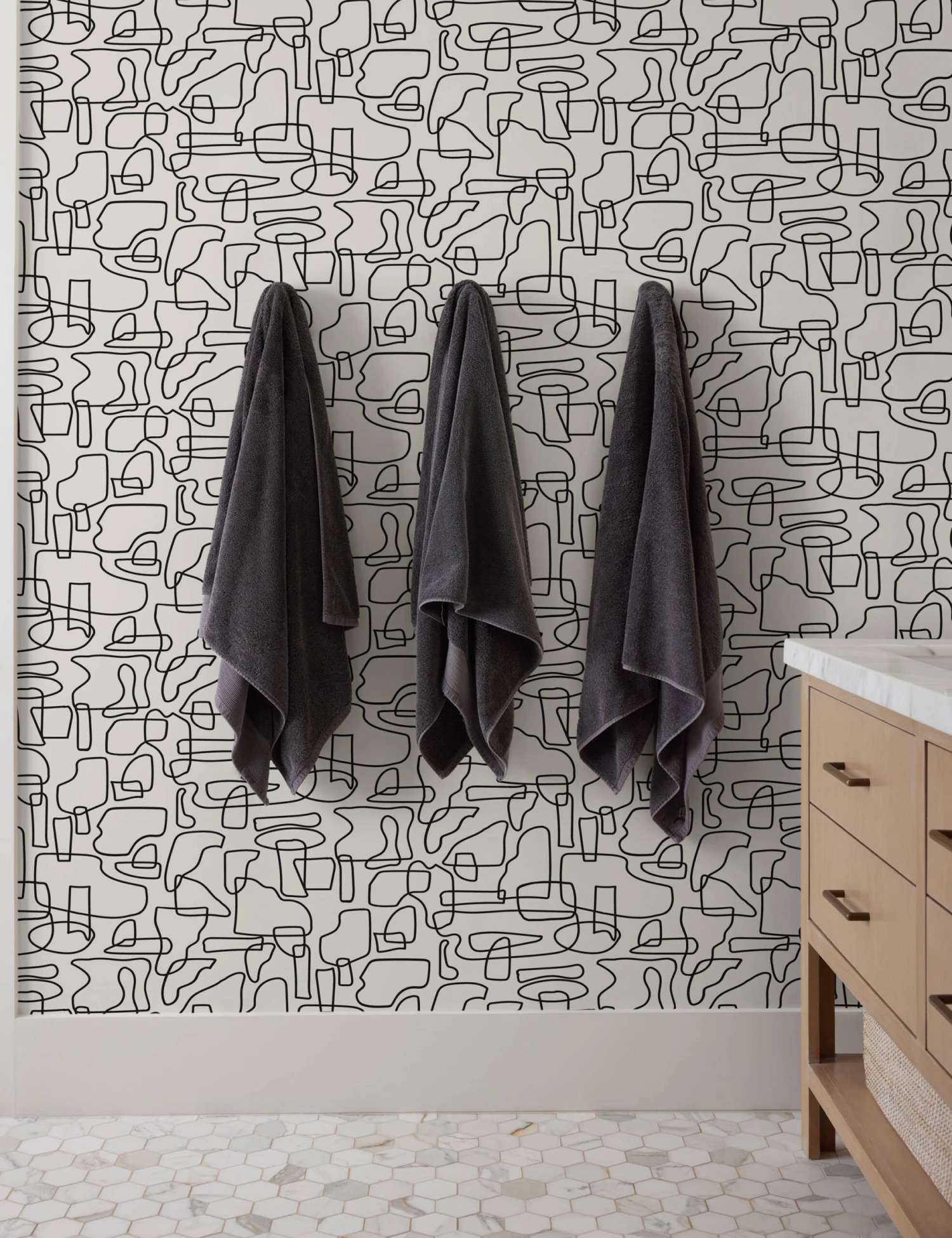 Bring a fresh edge to the room with this modern wallpaper design. In the style of abstract line art, Saunders sets the tone for a chic curation. The black-on-white minimalist palette lets you tailor the look to your decor living room to bath.
