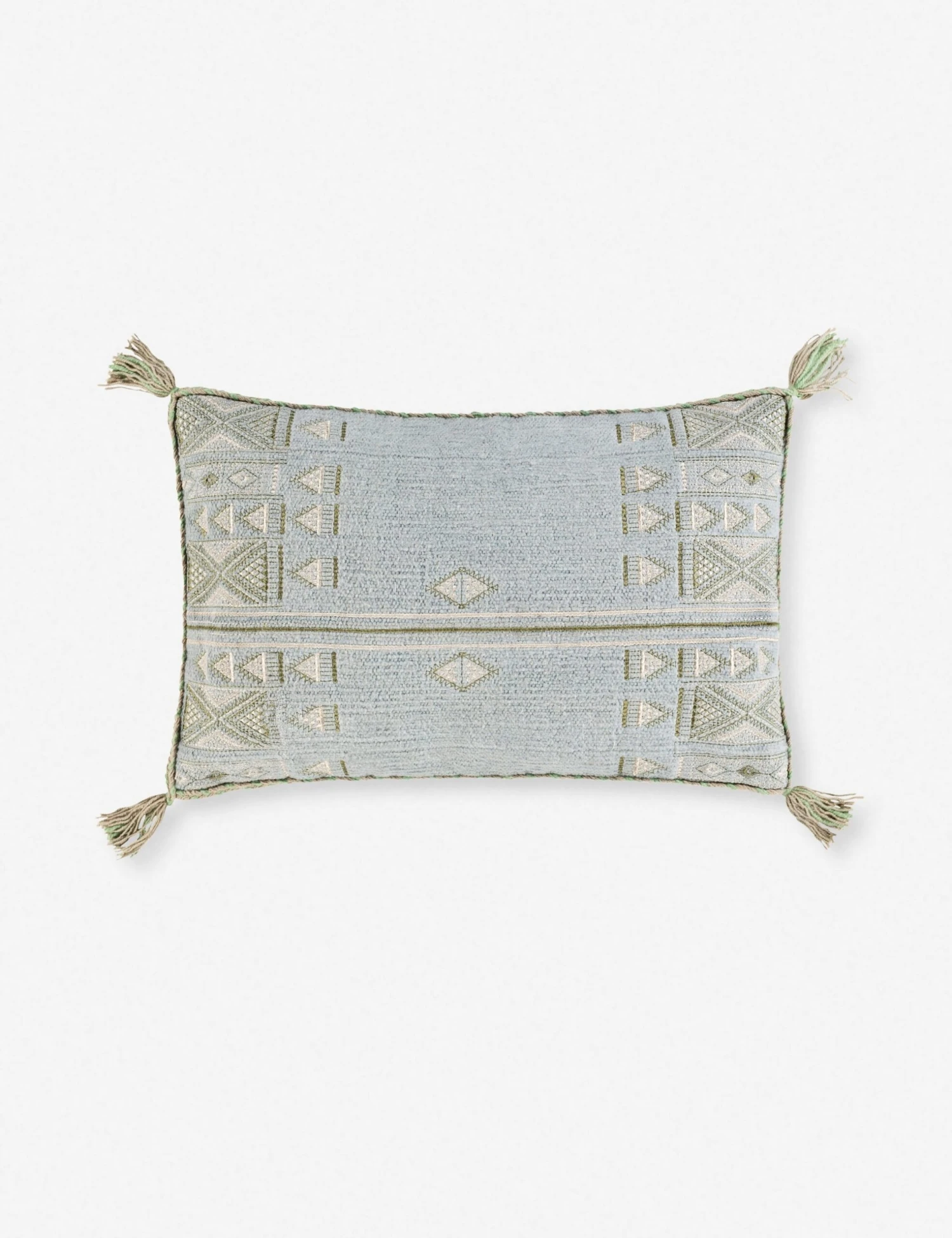 A charming addition to your seating room or guest bedroom, this lumbar pillow has a quiet elegance. Globally inspired embroidery, tassel corners and twisted piping have a bohemian undertone that can easily mix with contemporary pieces.