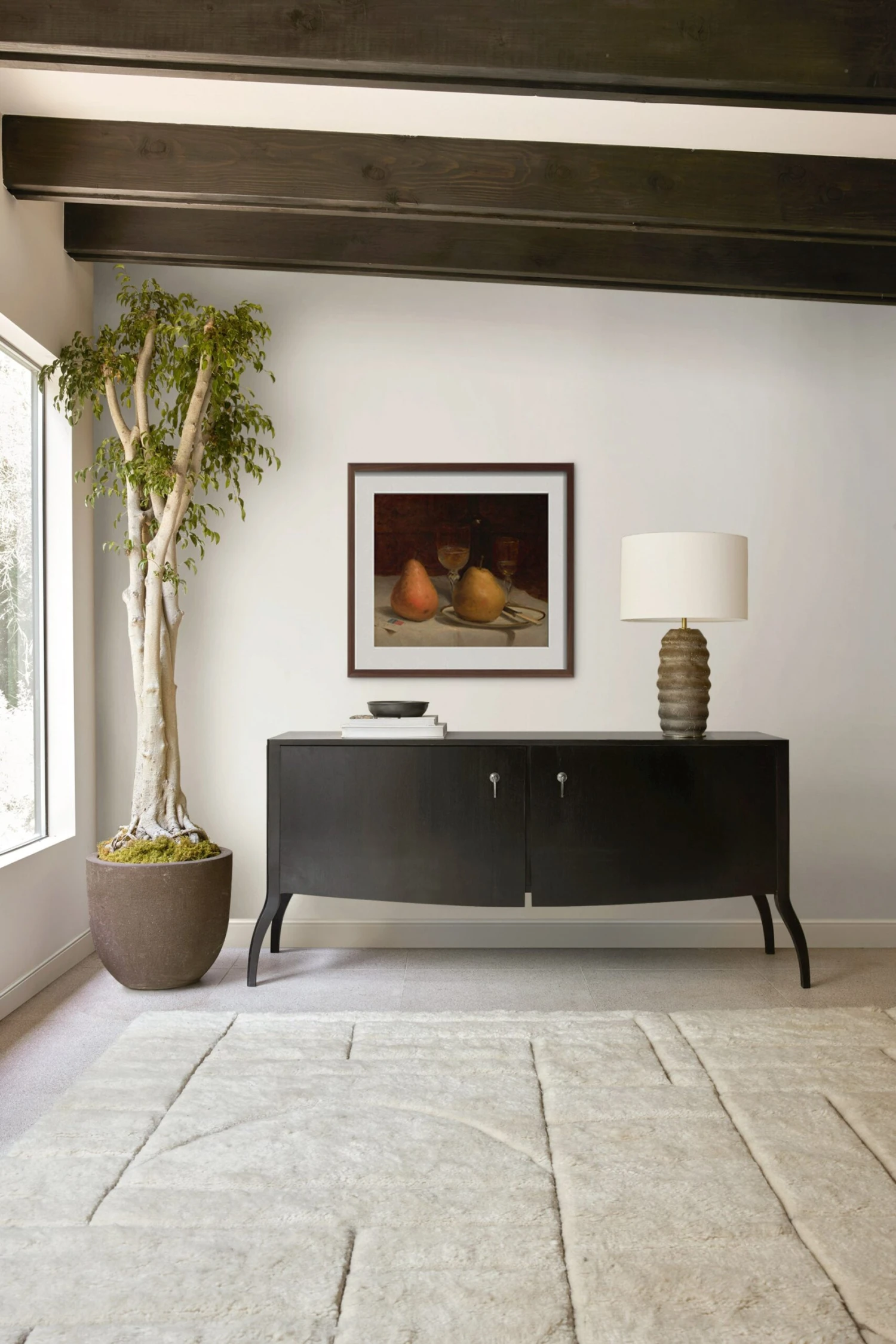 A painterly quality brings a soft beauty to this classic still life wall print featuring a tabletop setting of pears and wine. We love the classic tone and warm depth this wall print can bring to a traditionally inspired aesthetic.