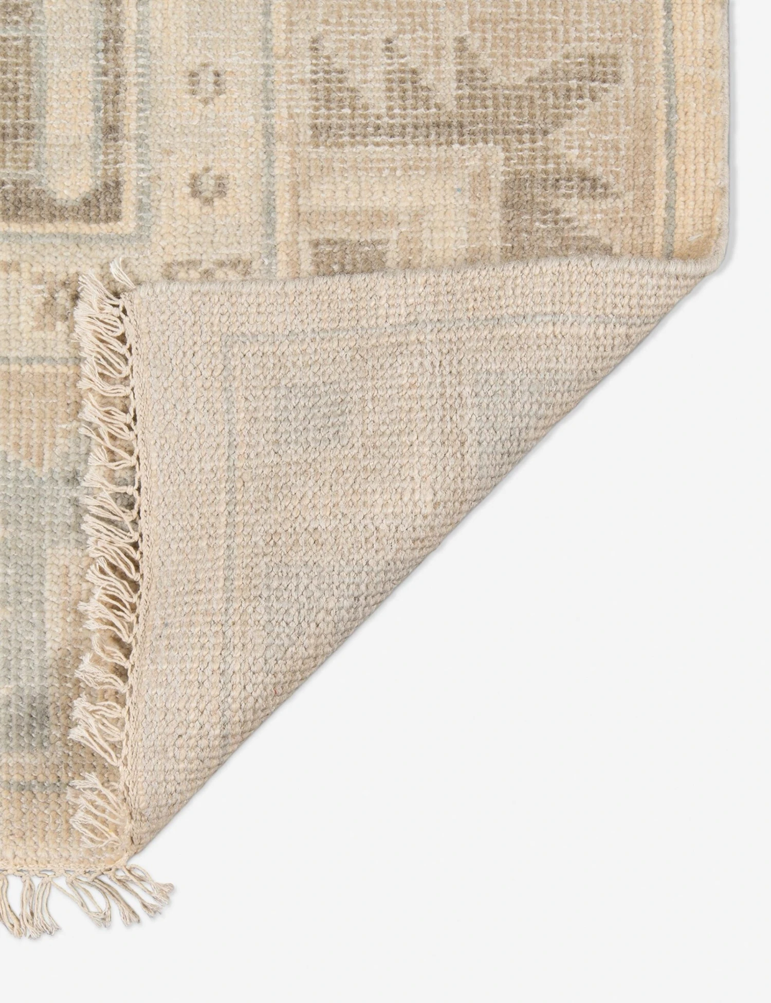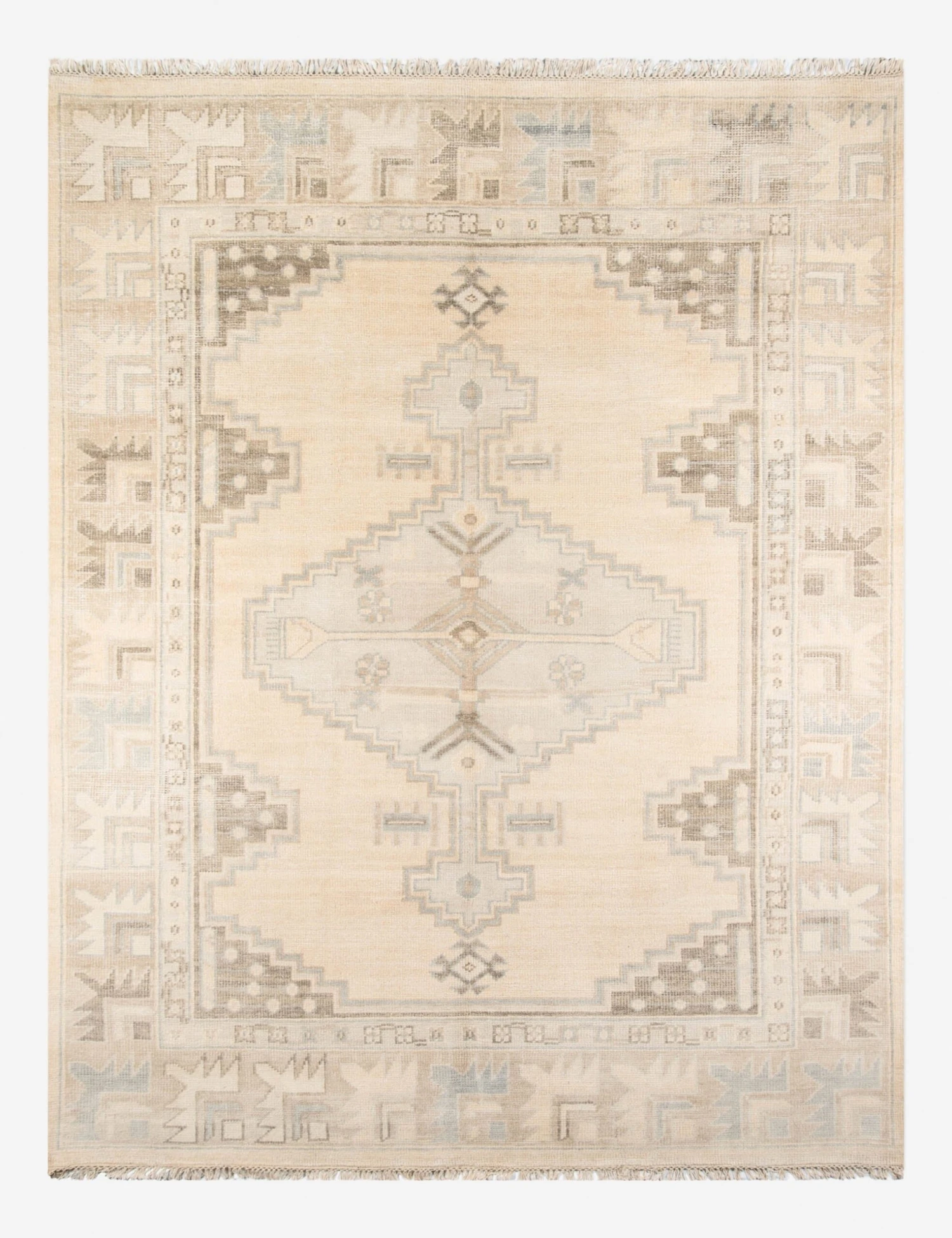 This floor rug stunningly balances a soft, washed-out color palette with a vintage kilim-inspired pattern. Its hand-knotted wool construction brilliantly reveals all the intricate details of its motif. Place this durable, low-pile area rug in a high-traffic area like your living, dining, or entryway spaces.