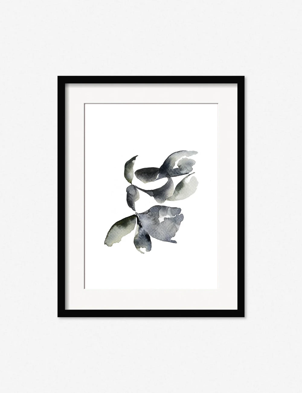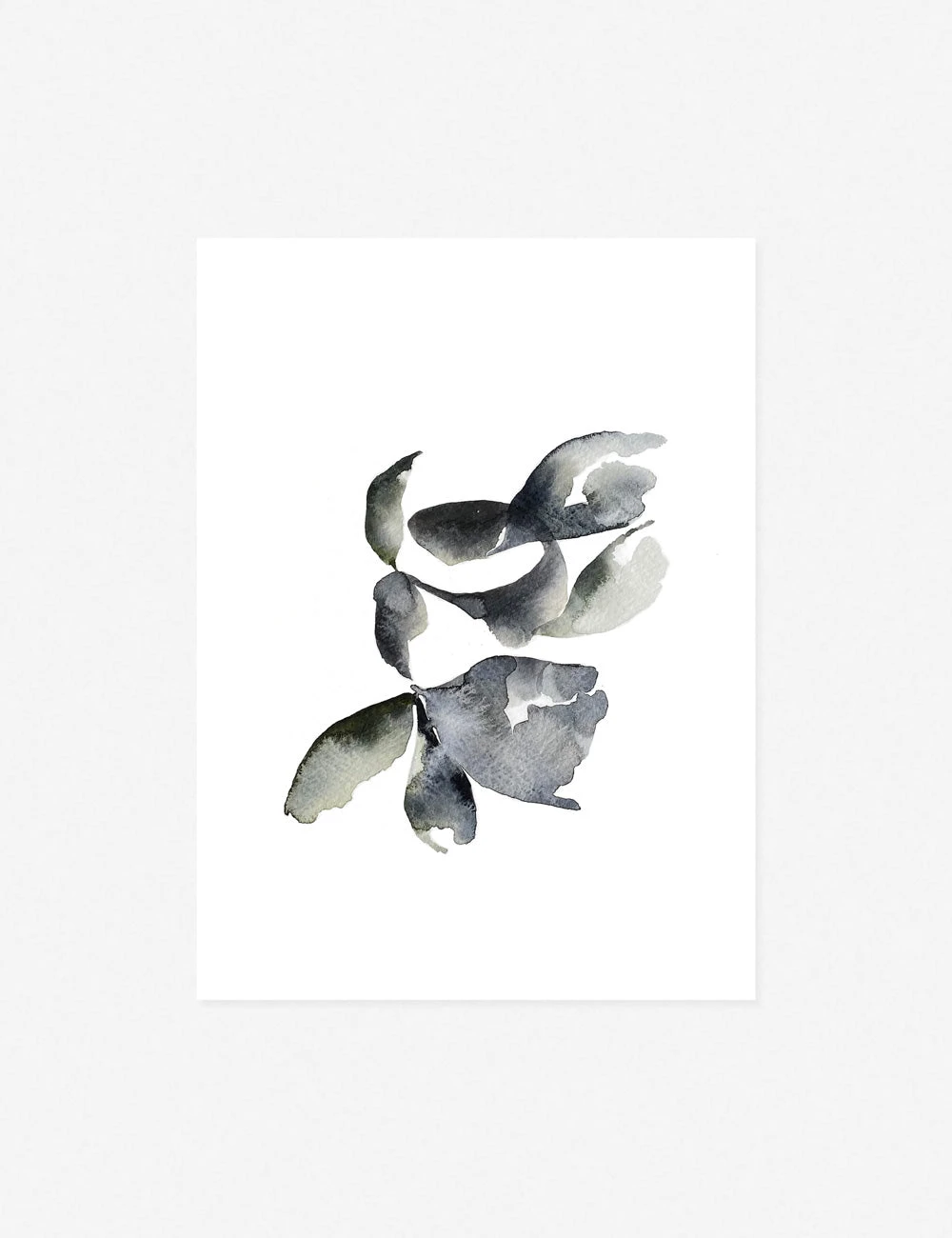 A cool, muted palette creates a delicate floral form at the center of this watercolor print. The minimalist composition imbues this piece with an understated appeal, perfect for a curated art wall or standalone wall artwork in a look that pairs airy profiles with sculptural shapes.